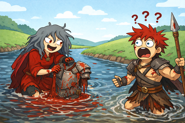 二人の最後の邂逅はとても印象的です。クー・フーリンが最後の戦場に向かう途中、川のほとりで血まみれの鎧を洗うモリガンの姿を見かけます。この行為は、古くから「その戦いに参加すれば死ぬ」という予兆を示すものとされています。その時、二人はすでに和解していましたが、クー・フーリンは何も言わず、モリガンから離れてそのまま戦場へ向かいました。