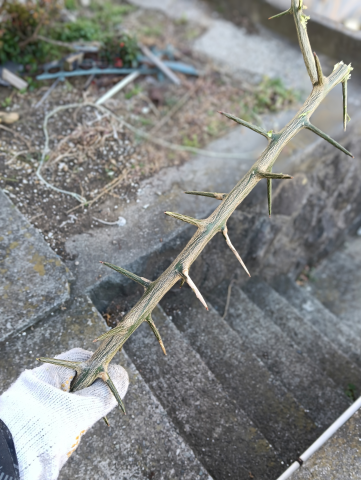 そして、柚子の最大の悪意ポイントと言えば、やはり「棘」です。写真をご覧ください。バラの棘がかわいく見えてしまうほど、柚子の棘は悪意の塊です。多分、心臓から上あたりにまともに刺さったら致命傷になるのでは、と本気で思うくらいの太い棘が下向きにズラリと装備されています。