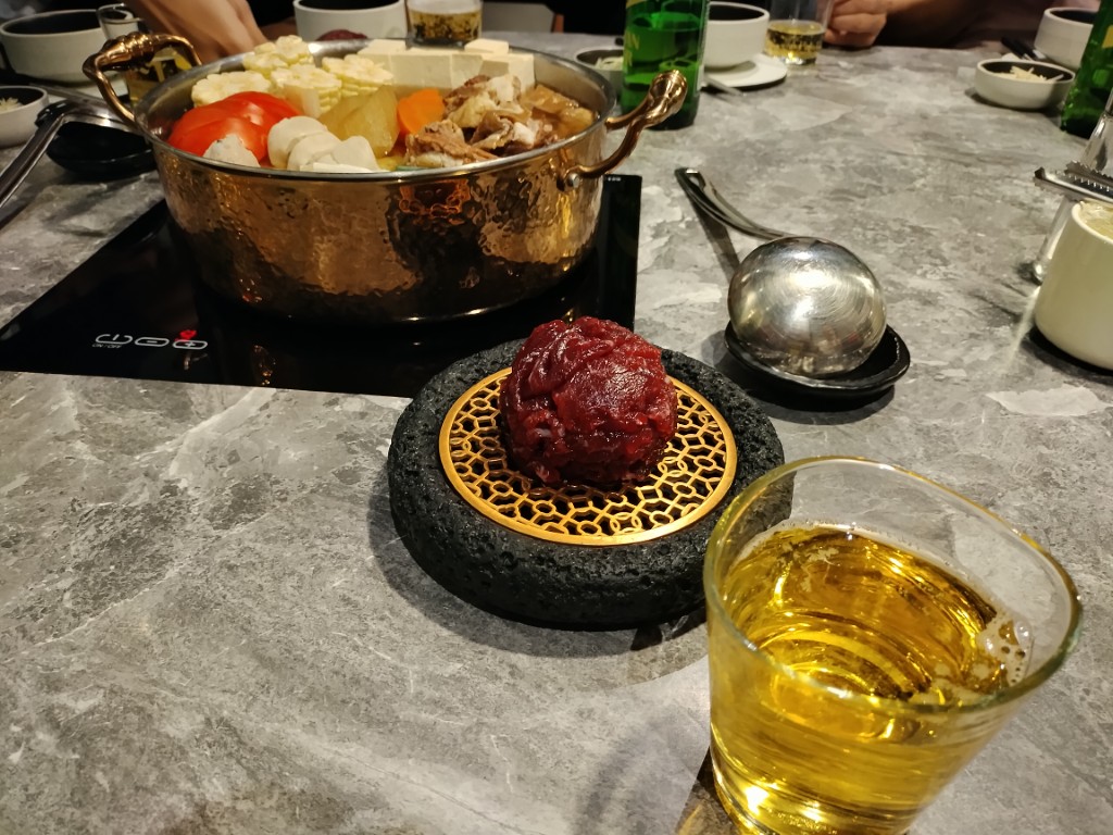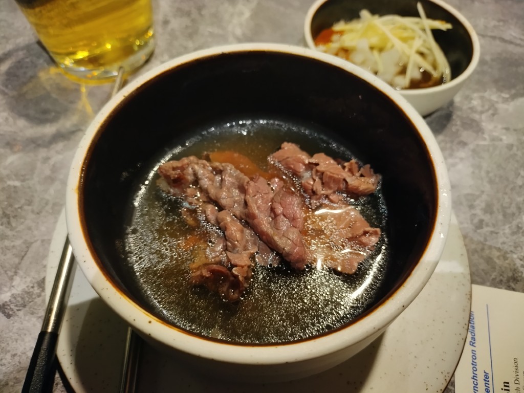 そして、その晩に驚愕したのが写真に写る赤い球体。アジアの食べ物なら大概の食べ方がわかっているつもりでしたが、甘かった。この球体に関しては材質も食べ方も全く想像できませんでした。これはどうやら「溫體牛蔬果湯頭」という鍋料理らしいです。まず、牛肉を処理の仕方が通常と異なるそうです。特別な処理をした薄い牛肉を丁寧に重ねて丸めた結果がこの赤い球体となります。この球体から、薄い牛肉を引きはがし、お椀に入れる。そして、野菜を含めた様々な具材で煮立ったスープをそのお椀に注ぎ、一呼吸おいてから応しい色に変化した牛肉を食します。しゃぶしゃぶの逆転させたような料理ですが、とにかくおいしかったです。残念ながら、この鍋料理を日本で簡単に食べることはできなさそうです。