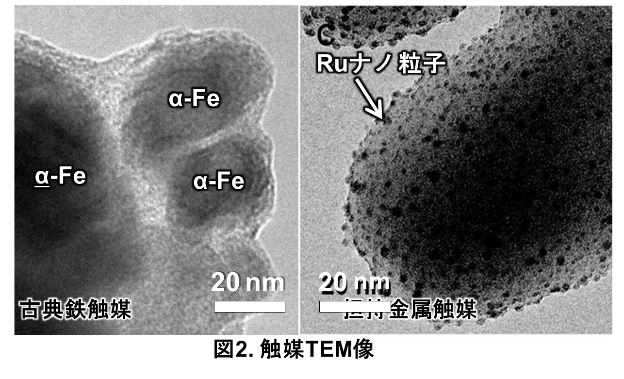 それでは、鉄のような安価な卑金属を使う触媒反応ではどうでしょうか。図2には1900年代初頭に設計され、現在もアンモニア製造に使われている古典鉄触媒の電子顕微鏡写真を示しました。図2に示した古典鉄触媒も最新の担持金属触媒も数十nm超えるメゾスケール粒子で、その体積に大きな差はありません。そして反応に使えるのは濃い色の金属部分です。どちらの触媒が表面の金属部が多いでしょうか。